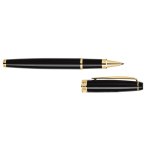 Cap-off design rollerball with high gloss black lacquer cap and barrel, solid heavyweight brass construction and gold clip and accents. Complies with Prop 65. 5/8″ W x 5 5/8″ H x 1/2″ D