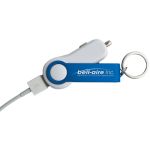 This Portable USB car charger conveniently swivels out for easy access. Made of aluminum and hard plastic it also doubles as a keychain. Laser Engraved Imprint. Complies with Prop 65.