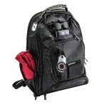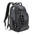 Our toughest travel backpack yet; 1680D/PVC/ polyester construction with heavy duty comfort grip cable handle; sternum strap; organizer pockets; air-channel back; water resistant pocket; ergonomic straps. Tech friendly features include: RFID shielding pocket; TSA-friendly laptop pocket; and felt lined tech pocket. Mountaineering-style webbing for exterior attachment points and hook and loop patch panel for logo and morale patches. (bag includes one rectangular patch). 8″ D x 19″ H x 14″ W