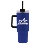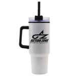 Enjoy all-day refreshment with this 40 oz. handled stainless steel tumbler. Designed with double-wall insulation, it keeps beverages hot or cold for hours, and the clear, screw-on lid features a spill-resistant design with a straw for versatile sipping. This travel mug is an exceptional choice for companies, universities, and nonprofits ready to take their brand wherever it roams. Complies with ANSI, CPSIA, FDA, Prop 65. 3.75″ W x 10.125″ H x 3.75″ D