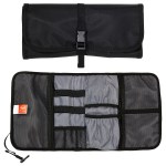 Amazing padded roll-up organizer with pockets end-to-end, 3 mesh pockets with self mending zippers, 3 mesh pockets with elastic openings, 2 nylon pockets with elastic openings, 4 sure-grip elastic bands, Nylon outer shell, Organizer is secured with adjust. Complies with Prop 65. 17.5″ L x 9″ W x 0.25″ H