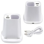 Annex Wireless Charging Stand blends style and practicality with its 15W fast wireless charging capability. Equipped with USB-C and USB outputs, it allows simultaneous charging of three devices, ensuring convenience and efficiency. The integrated pen holder keeps a workspace organized. With PD3.0 and QC3.0 support, it’s perfect for office desks or bedside tables, combining functionality with a sleek design. Complies with FCC, Prop 65. 3.625″ L x 4.25″ W x 3.5″ H