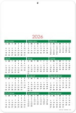 These cards are made from white 10 pt. paper stock and are coated on 1 side. Includes 12 months at a glance printed in black only with a hole at the top for hanging. 6″ W x 9″ H