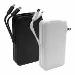 10,000mAh | 5-in-1: AC Wall Charger, USB in/out port, USB-C in/out port, built-in USB-C and Lightning-compatible charging cables | Digital power level indicator | Power Delivery. Complies with CE, FCC, Prop 65, RoHS. 4.52″ L x 2.5″ W x 1.04″ H
