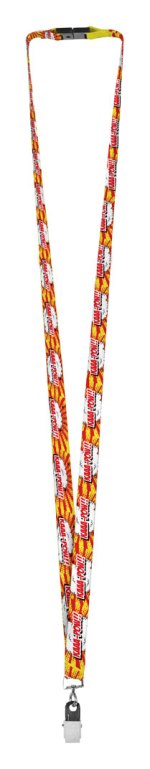 Measuring 1/2″ wide x 36″ long, each lanyard includes a 2-sided step and repeat heat transfer imprint. Choose from a large selection of attachments. The logo must be the same on each side and the second side will have a random starting point. This works best for multi-color, full color and gradient logos. Best for multi-color, full color and gradient logos. Artwork is printed on special paper and dye sublimated with heat and pressure onto the lanyards. Complies with CCPSA, CPSIA, Prop 65. 1/2″ W x 36″ L
