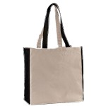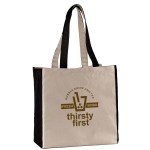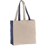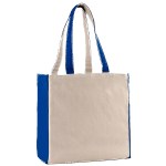 10 oz. cotton canvas tote bag with large main compartment. Matching color accents on outside of handles, side of tote, and bottom of tote. 15″ H x 14″ W x 7″ D