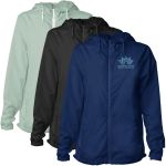 Lightweight & Packable — perfect for travel or on-the-go use. Adjustable Hood with drawstrings for customizable coverage. Full-zip front for easy layering and quick ventilation. Elastic cuffs and side slash pockets. Add your custom embroidered message or logo . Complies with Prop 65.