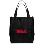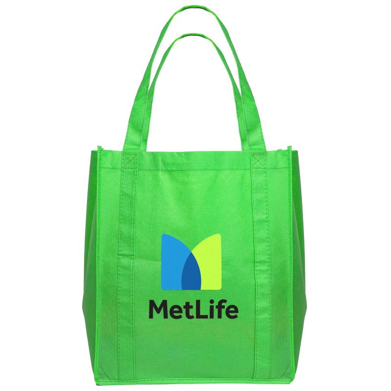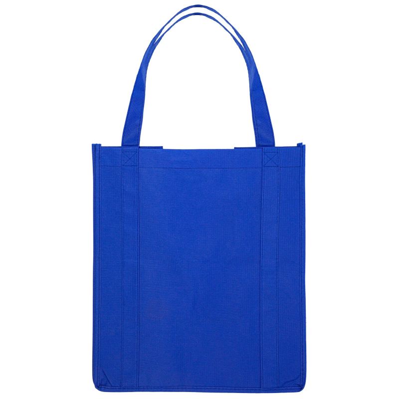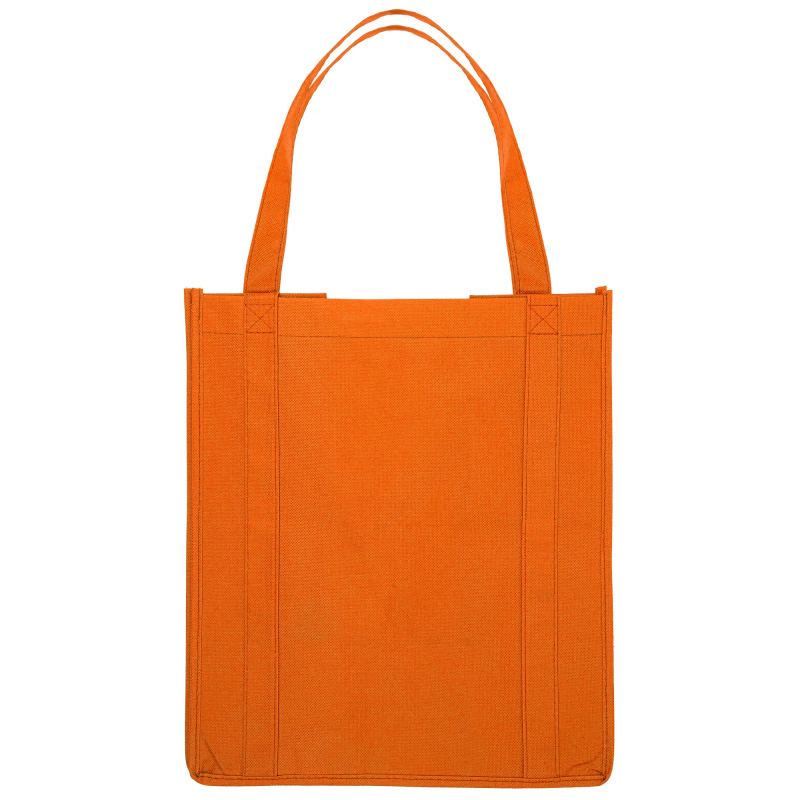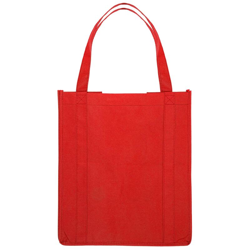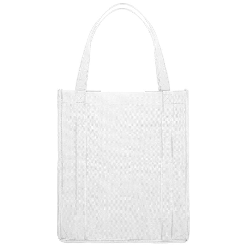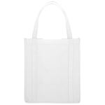 Non-woven 80GSM material, durable stitched handles, eco-friendly, polypropylene, made of 100% recycled materials. 12″ L x 8″ W x 12″ H