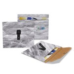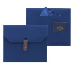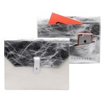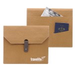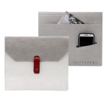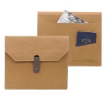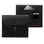 envelope folio with knob leather lappet closure, back outside pocket with slit for smartphone. Duotone possible within the same type of material (Earth or Colors). Complies with FSC, Prop 65. 12″ W x 9″ L