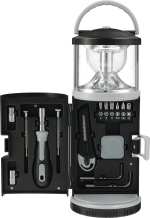 The 15 piece Tool Kit with Multi Function Lantern is the ultimate outdoor tool kit. The featured tools are conveniently stored in a compartment under the lantern. Tools include two piece key hex, measuring tape, box cutter, two sockets, two precision screwdrivers, one screwdriver handle and six screwdriver bits. Lantern modes are solid white and flashing red lights and comes with 3AA batteries. 3.66″ D x 3.82″ W x 9.65″ H
