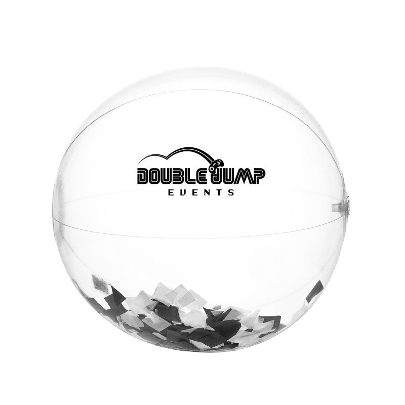 Create a spectacle at your next marketing or social event with these beach balls with a fun and festive confetti fill! This inflatable beach toy is made of clear PVC material and blows up to 16″. The see through design shows off the loose black and white confetti fill inside that moves and turns when you toss or catch it. What a great idea for beach and pool adjacent events, music festivals, dances, raves, carnivals, parties and much more. Complies with CPSIA. 16″ W