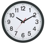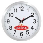 16″ plastic wall clock with quartz analog movement. Metallic silver or black plastic frame; slim width for easy hanging. Uses 1 AA battery (included). Packaged in white gift box. 15.0625″ D x 1.5″ W