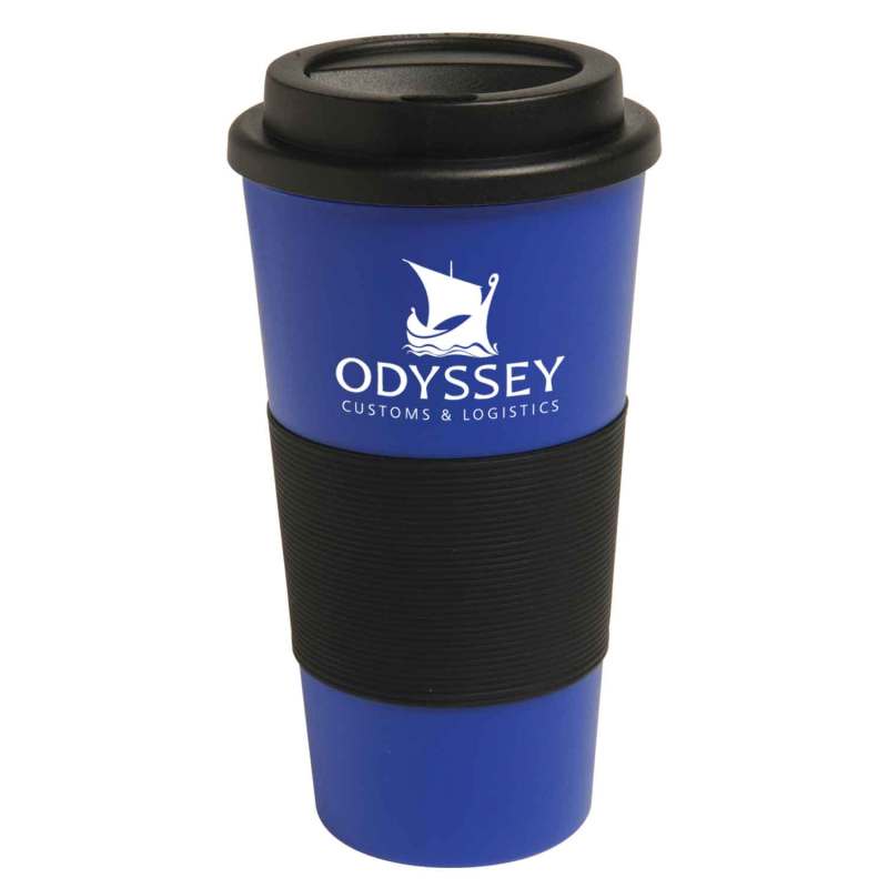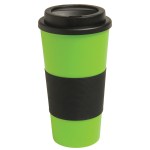 This double wall insulated tumbler makes handling hot drinks easy when on the go. The 16 Oz. design features a silicone comfort grip with matching twist-on lid. It fits most auto cup holders and is BPA free. This product ships assembled and is reusable and recyclable, and top rack dishwasher and microwave safe. Ideal for school events, corporations, company picnics and sports sponsorships. Complies with Prop 65. 7″ H x 3 3/4″ Diameter