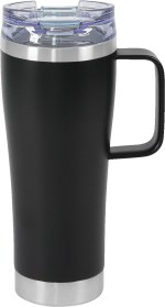 Dual wall Stainless Steel construction. Copper lined vacuum-insulated deep draw liner maintains optimal 10X drinking temperatures. Lead-free vacuum seal. 5 mm handle. Features a push on, spill-proof AS plastic flip top design with Tritan snap locking closure lid. Durable powder-coated finish with Stainless Steel top and bottom rim accents. Sweat-free design. 9″ H x 4.625″ W x 3.25″ D