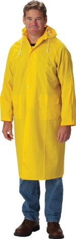 Protect yourself against rain, sleet, or freezing rain in our .35mm think PVC and Polyester raincoat. Featuring a detachable hood with drawstring, 2 external pockets with storm flaps, underarm vents and cape vented back and corduroy collar for added comfort. Sizing starts from a Small and goes all the way to a 5X. Complies with Prop 65. 1″ D x 19″ W x 55″ H