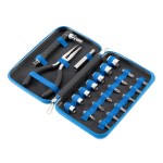 This beautiful silver and blue tool kit contains 22 pieces. It has an L-Shape wrench, pliers, socket adaptor, 7 sockets, and 12 screwdriver bits all strapped into a tin zipper case. 6.125″ W x 4.375″ H x 1.25″ D