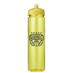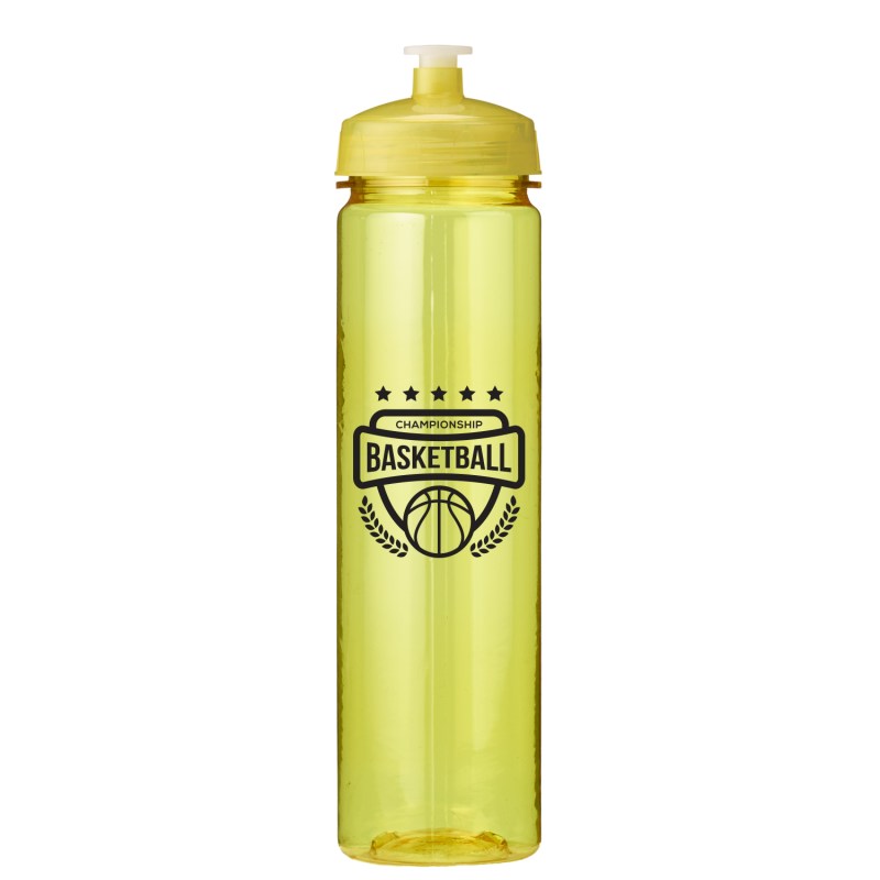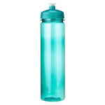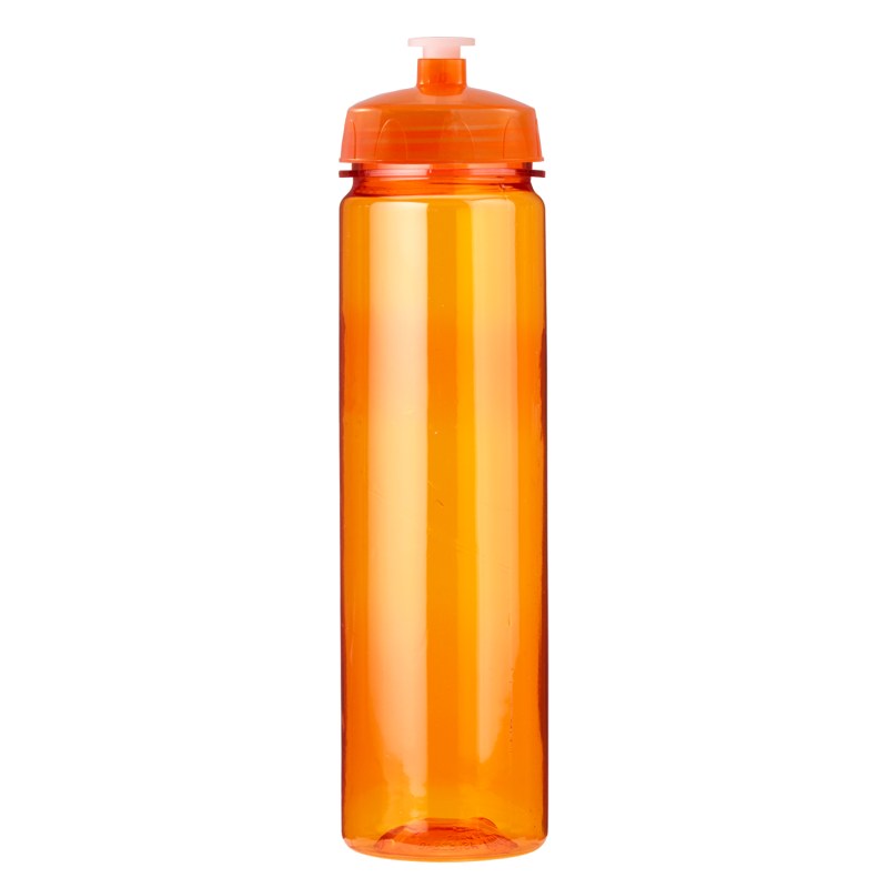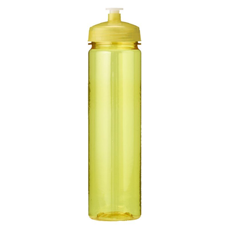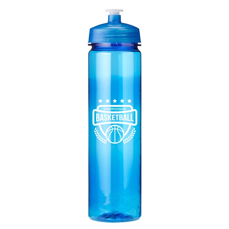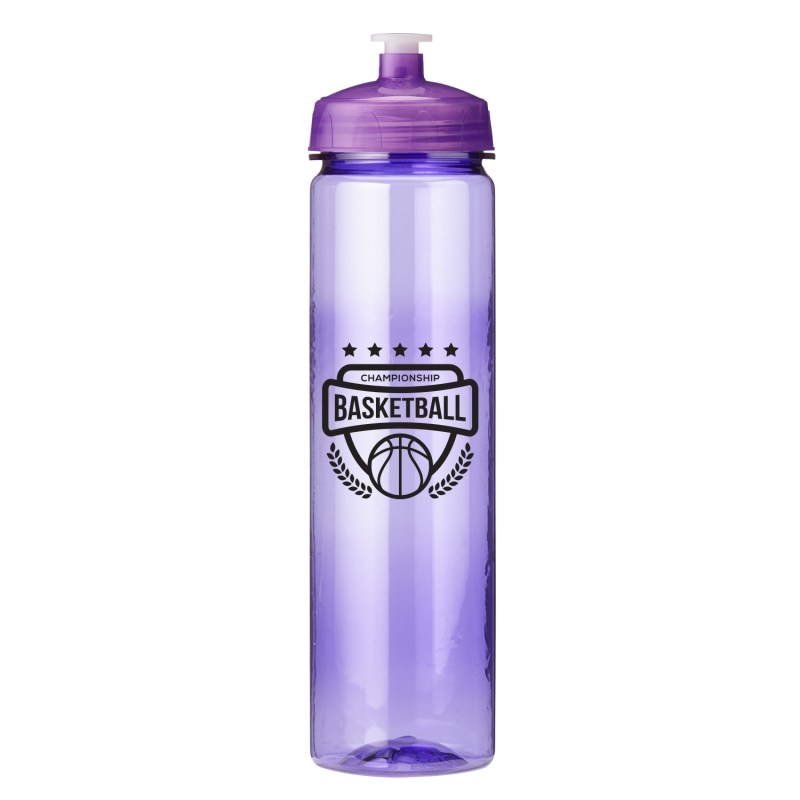 This Food Grade PET bottle features a distinct thin Euro body and is BPA Free. Easily add ice cubes with the wide mouth design. They feature a matching colored leak-resistant push-pull lid. The PolySure™ Refresh Bottles come in a lustrous, high gloss finish, and will fit most auto cup holders. Hand wash only. Standard lid colors available: blue, red, purple, green, orange, pink, clear aqua blue, yellow, smoke gray, black, white. Complies with Prop 65. 10 1/4″ H x 2 5/8″ Diameter