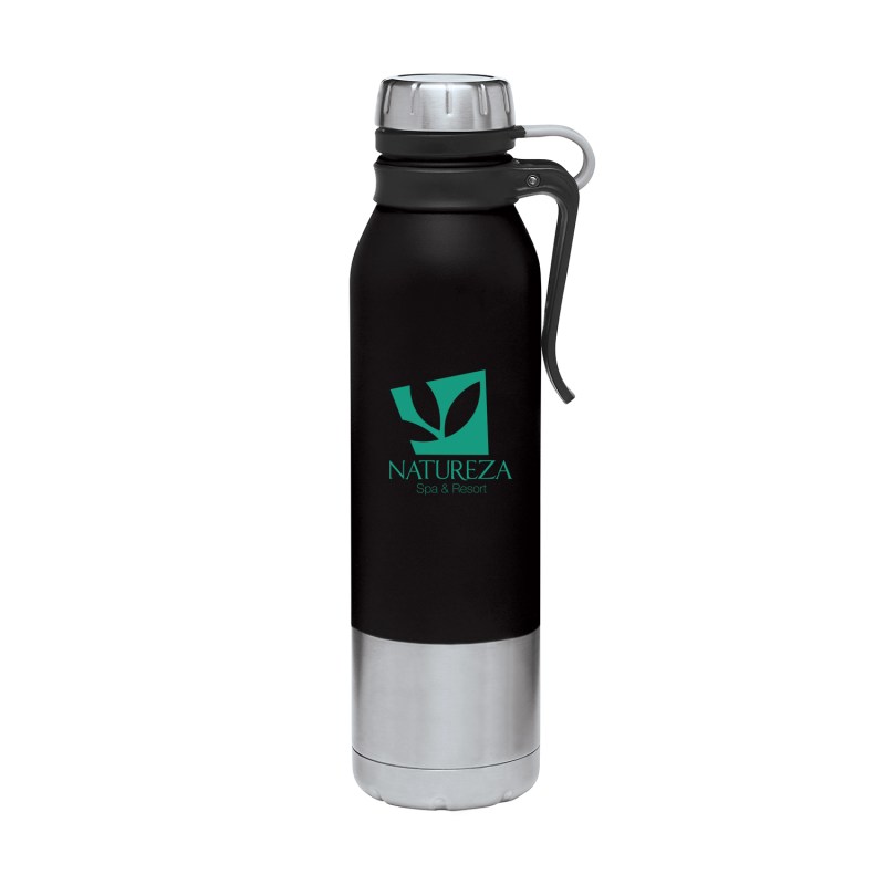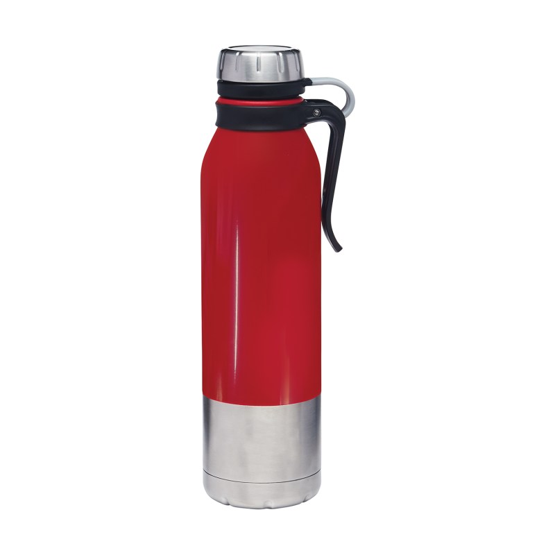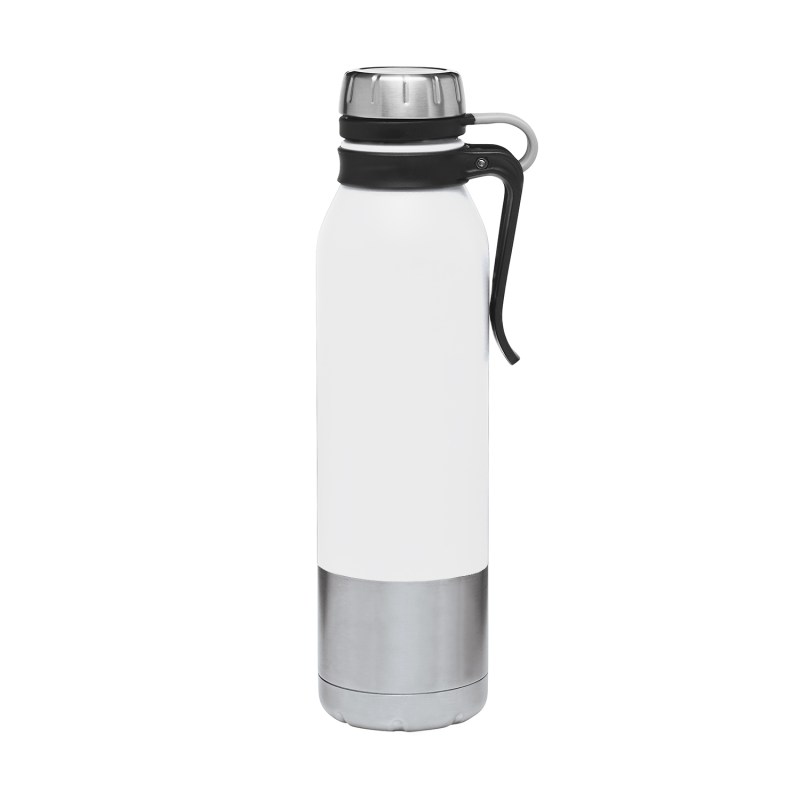 This stylish 25 ounce, double-wall, stainless-steel vacuum bottle features a twist-on cap with rubber tether and a large clip handle. 3.0″ W x 11.25″ H x 3.0″ D