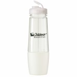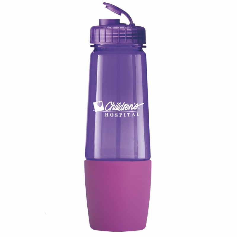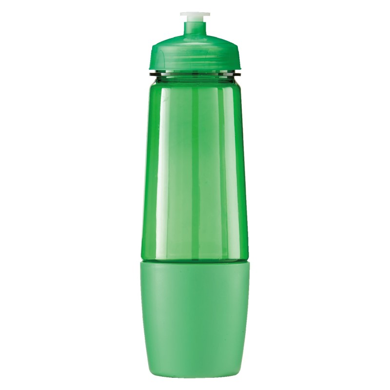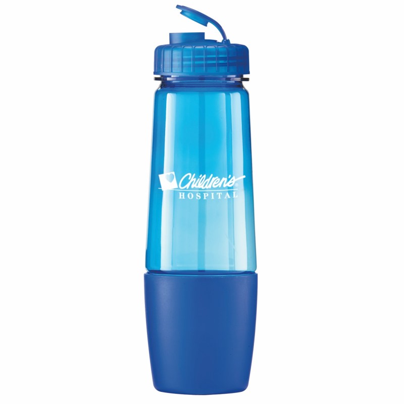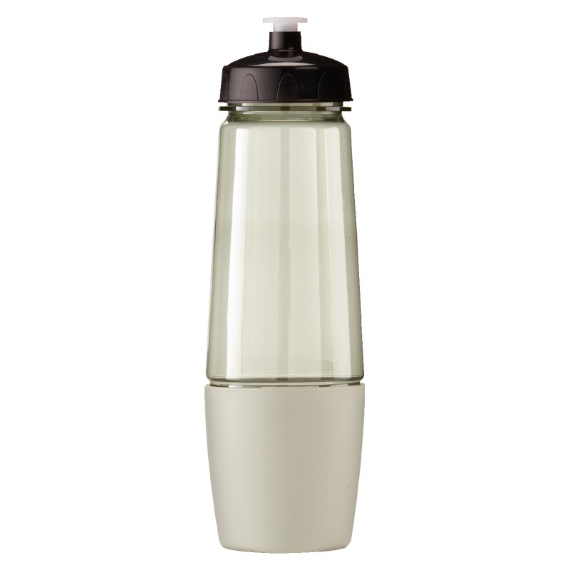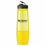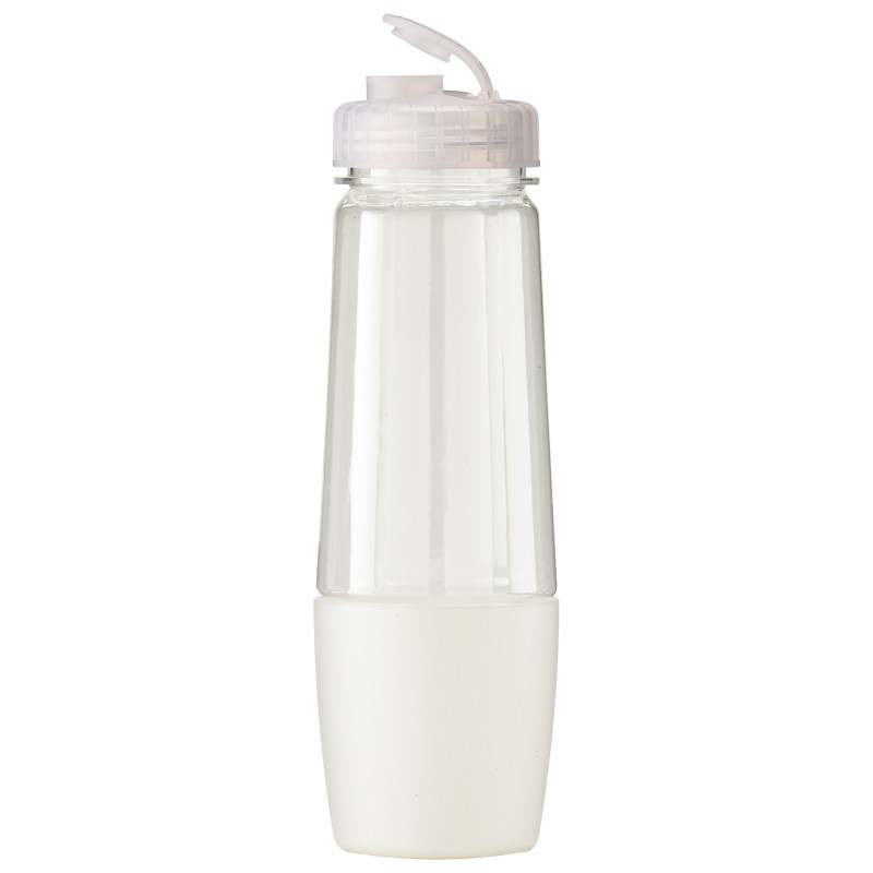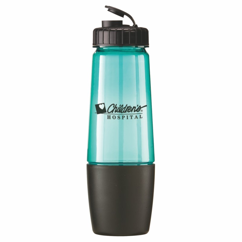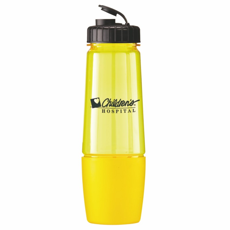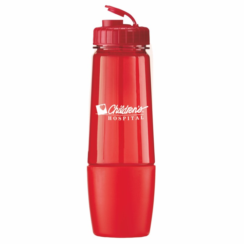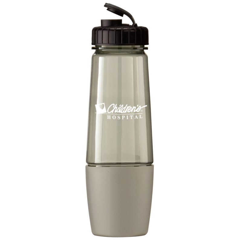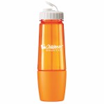 This bottle has a removable cup on bottom for storing pills or powder. The cup can also be filled with water after being removed from bottom of bottle. The food grade PET bottle has a lustrous, high gloss finish and reusable and recyclable. It features a leak resistant flip top lid and fit most auto cup holders. Hand wash only. Complies with Prop 65. 10 1/4″ H x 3 1/8″ Diameter