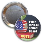 Safety pin backed circle button with full color imprint. 3.0″ W x 3.0″ H x 0.25″ D