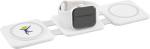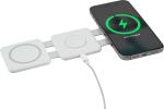 The 3-in-1 Power Fold 15W MagClick™ Wireless Chargers is designed with dedicated charging spots for smartphones, Apple Watches and Airpods/Airpod Pros. The left pad is embedded magnets inside helping easy alignment with iPhone 12 models and above supporting wireless charging at up to 15W for Android devices and up to 7.5W for All iPhone 8 and above series. The middle pad supports wireless charging at up to 1.5W for Apple Watches, while the right pad with 3W wireless charging for any enabled devices. The Watch charger on the middle pad can be pulled up and aligned in place while charging. It works with most plastic phone/airpods cases on and includes 39-inch Type-C to Type-C cable. It is recommended to use UL or ETL Listed 20W USB-C power adapter. Packaged in a FSC® certified premium gift box. 2.80″ D x 3.35″ W x 0.94″ H