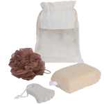 The 3-Piece Jute Spa Set includes a loofah, pumice stone and sponge for smooth skin, plus a pouch for storage. 2.00″ D x 6.91″ W x 10.00″ H