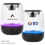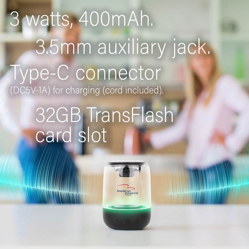 Enjoy multiple ways to listen to your favorite content and with powerful sound quality! Multi-function interface, including play, pause, phone functions, volume & shuffle. 3.5mm auxiliary jack for wired connectivity if desired (included). LEDs flicker & change color with the audio. Type-C connector (DC5V-2A) for charging (cord included). Bluetooth range: 10 meters or less. 32GB TF (TransFlash) card slot for playing of music files (card not included). 2 3/4″ W x 3 1/2″ H