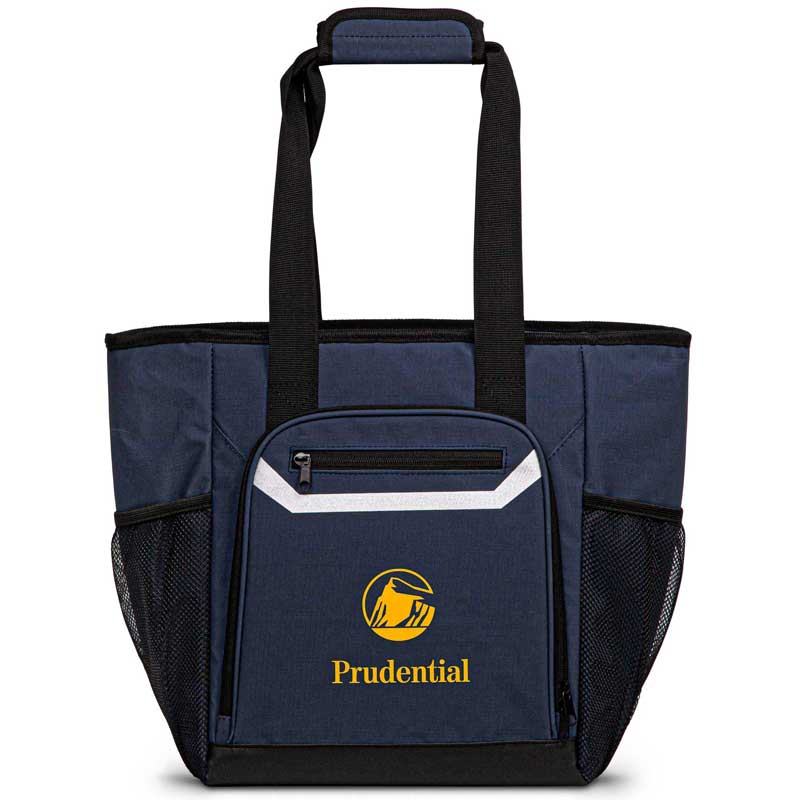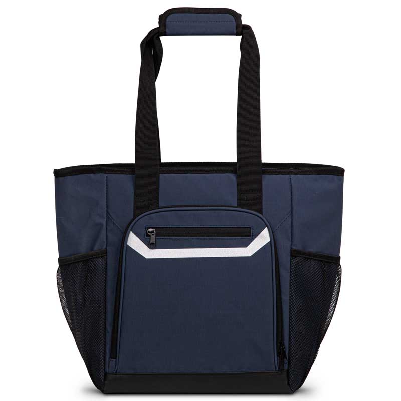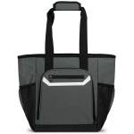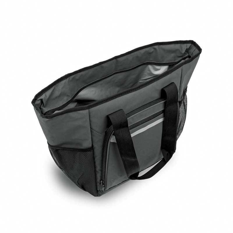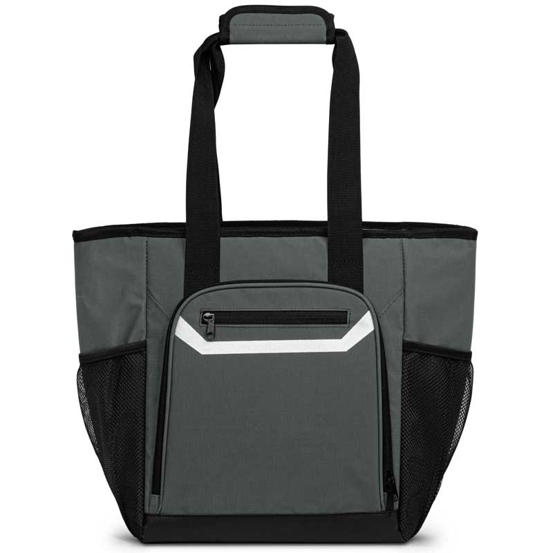 Zipper Top, Zipper Pockets, Front Pockets, Dual Mesh Pockets, Cushioned Handles, Insulated, Lunch Box, Cooler, 210 Ripstop, TPE Coating, Polyethylene Foam, PEVA Waterproof Coating. Complies with Prop 65. 19 1/2″ W x 14″ H x 9 1/2″ D