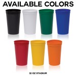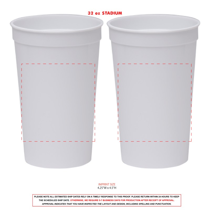 32 oz. unbreakable, plastic stadium cup available in 7 great colors! This best-seller is USA-made and is perfect for tailgating, beach, lake, sporting events, festivals, outdoor activities, and events of any kind. BPA-free and recyclable. Hand Wash Only. Complies with Prop 65. 4″ W x 6 3/4″ H