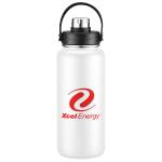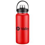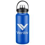 Large 34oz stainless steel water bottle with double-wall insulation, flip spout lid, and folding carry handle for all-day hydration.
