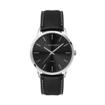 39.5mm polished silver metal case, japan 3-hand mvt, flat mineral crystal, black leather strap, water resistant to 3 atm. Complies with Prop 65. 1″ W x 1″ H x 1″ D