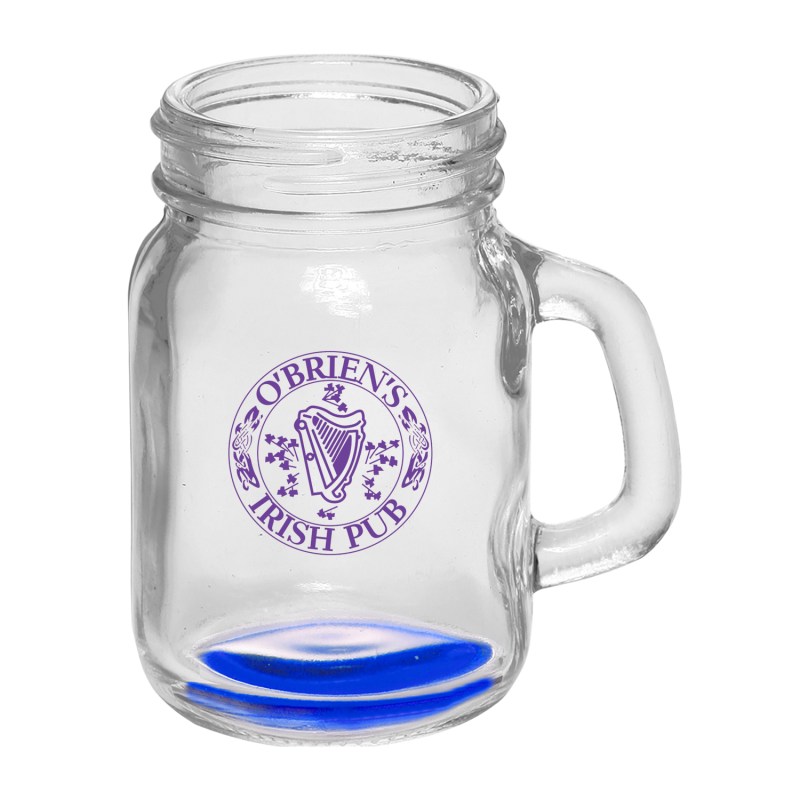 4.5 oz. of liquid capacity, comfortable handles and large imprint areas that can be printed with your bar or restaurant logo design. Great for grand openings and other events of the like, our personalized glass mason jars are unique barware items that will get the attention of your guests. Add a color bottom for a fee. Additional production time may apply. Glassware products should be handwashed. These products are not guaranteed to be dishwasher safe. 2.0″ W x 3.25″ H x 1.5″ D