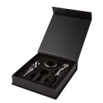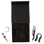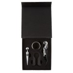 This wine tool set includes a wine opener, wine stopper, foil cutter, and drip collar. Easy to store in black gift box with magnetic closure. Set items feature a matte finish metal body with stainless steel accents. Features a black non-stick coated corkscrew and double hinge lever. 4 1/2″x4 1/2″ Vibrant Full Color Digital Direct imprint available. 1 1/4″ H x 5 1/2″ W x 6 1/8″ L