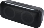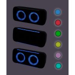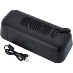 Media shortcut keys Made from ABS Plastic and features non-slip feet Approx 7 hours of battery life Can be dual paired for TWS function Features multiple party light modes for main, top, and bottom lights Operating range: up to 33ft/10m Approx 3 4 hours charging time Includes USB-C charging cable and users manual Power bank function: 3000 mAh Premium sound Bluetooth 40 watt speaker Connect via Bluetooth 5.0 technology, AUX port, USB play port, or micro SD/TF card port IPX6 rating. 4″ D x 11.25″ W x 5″ H