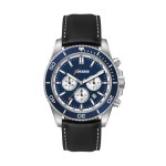 42.5mm stainless steel brushed silver case, blue bezel, japan chrono mvt, date display, flat mineral crystal, black leather strap, water resistant to 10 atm. Complies with Prop 65. 1″ W x 1″ H x 1″ D