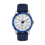 43.5mm stainless steel brushed silver case, blue bezel, japan 3-hand mvt, date display, flat mineral crystal, black leather strap, water resistant to 10 atm. Complies with Prop 65. 1″ W x 1″ H x 1″ D