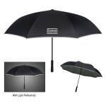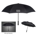 Manual Open. Metal Shaft. Inverted Design Keeps You Dry When Closing. Contrasting Underside. Pongee Material With Patented Reflective Piping Accents. 29″ Closed. Complies with Prop 65. 29.5″ H