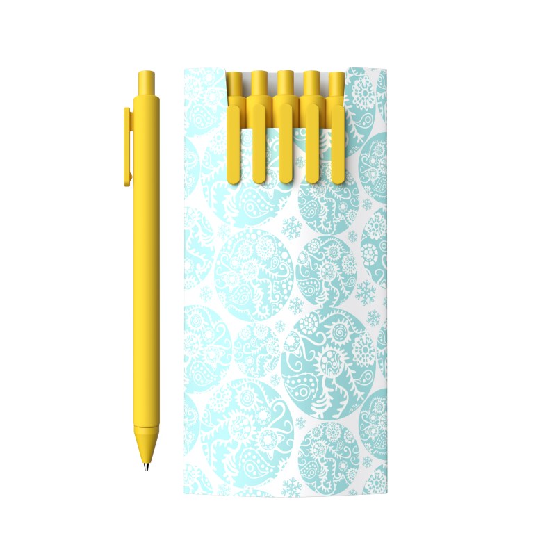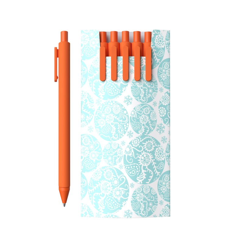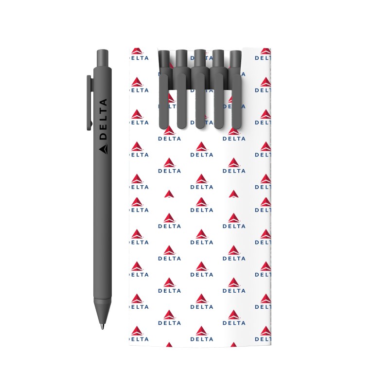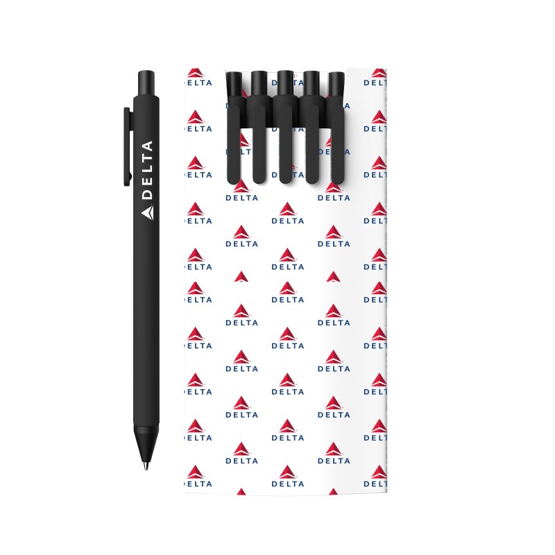 A collection of five Alix Ballpoint Pens, presented in a one-of-a kind custom decorated sleeve. The custom decorated sleeve is a versatile and effective promotional tool that can help businesses elevate their branding and marketing efforts, increase customer engagement, and leave a lasting impression on their audience. 6.7500″ L x 3.2500″ W x 0.6600″ H
