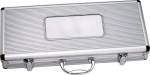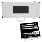 Implements made with FDA compliant Stainless Elegant metal carrying case, with quality corner finishing and hinging. Includes spatula with built in serrated blade and bottle opener, tongs, fork, cutting knife and sauce brush. 9″ D x 19.5″ W x 3.375″ H
