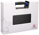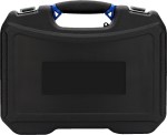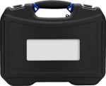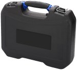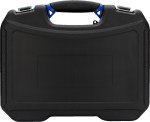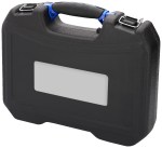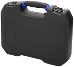 Rugged integrated handle with blue accents, and double Metal latches Housed and organized in a black blow-molded Plastic case Contents include one 5M measuring tape, a 25mm bit-set (32-piece), a screwdriver, 6 long nose plier, 6 diagonal cutting plier, 8 adjustable wrench, a hex key wrench with 8 piece keys (1/16-5/64-3/32-1/8-5/32-3/16-7/32-1/4), a knife, a 13oz claw hammer, 1 piece bit driver, 1 piece universal shear, and a 4 piece precision screwdriver set. 3″ D x 13.5″ W x 11″ H