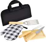 This 5pc BBQ Set includes spatula with built-in bottle opener, fork, and knife (all with wooden handles), matching wooden cutting board, and a black and white plaid grilling mitt. This 5pc BBQ Set includes a zippered carrying case. 1.75″ D x 5.75″ W x 13.00″ H