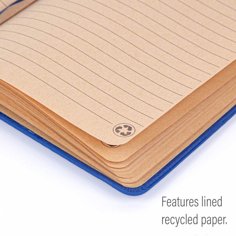 Great functionality as our other 5×7 journals, but with the added benefits of recycled materials! Features recycled leatherette (PU) covers and lined recycled paper. Elastic strap keep the journal securely closed. Comes with a bookmark. 5″ L x 7″ W