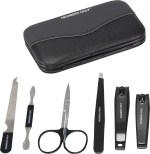 Includes nail clipper, nail scissors, dual ended cuticle pusher, nail file, tweezer and carry case Made from high quality stainless steel for durability and precision. 2.75″ D x 4.25″ W x 0.5″ H