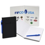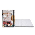 Elastic pen loop built into the spine (pen not included). Expandable back pocket. Black fabric bookbinding lays flat. 100 lined or graph sheets (50# text white paper). Glossy Full Color process imprint on the front cover, classic chipboard on the back cover. Pick your color for a round Elastic closure. Add a full-color back cover as an option. Complies with FSC, Prop 65. 6″ W x 8.5″ L x 0.5″ H