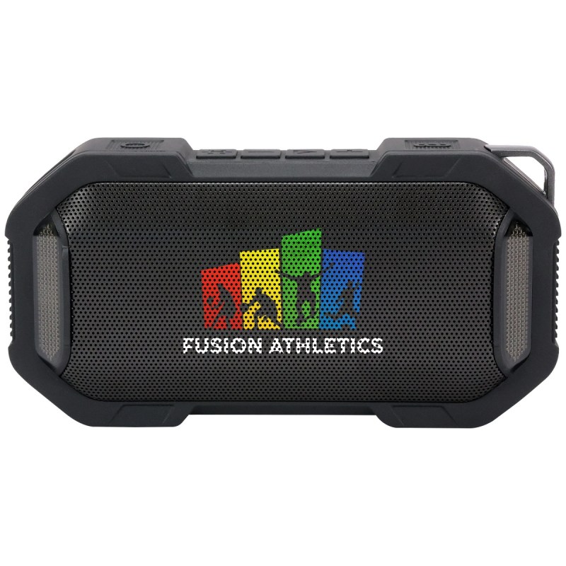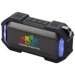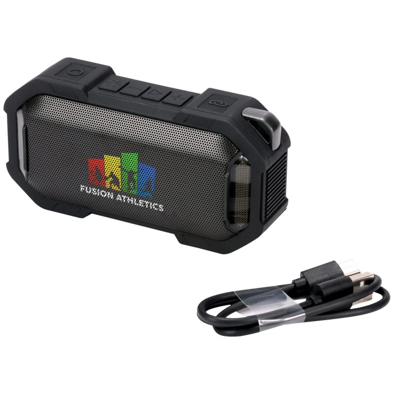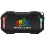 Portable Bluetooth speaker with light-up LED design. Speaker output: 7WBattery capacity: 1,800mAh (3.7V). Features multiple light modes. Playtime: approx. 3 hrs. Charging time: approx. 3.5 hrs. Type-C charging port. 2.5″ H x 5″ W x 1.5″ D