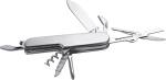 The 8-Function Stainless Steel Knife includes a knife, nail file, scissors, can opener, bottle opener/flat-head screwdriver, a Phillips-head screwdriver, a corkscrew and a mini metal split key ring. 0.50″ D x 3.50″ W x 0.94″ H
