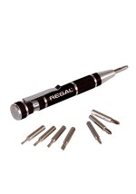 This pen shaped Screwdriver is made of aluminum alloy metal and features 8 different functions. It holds a combination of replaceable screwdriver bits: 4 flat and 4 Phillips. Strong magnet holds the bits firmly in the tip of the tool for ease of use. 4 1/4″ L x 1/2″ W x 1/2″ H