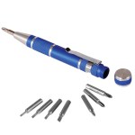 Complete with a clip for easy traveling, this tool features 8 interchangable screwdriver bits (Phillips and Flathead – 4 sizes each) neatly stored inside and kept in place with a screw top lid. 4.25″ W x 0.625″ H x 0.625″ D