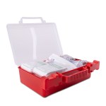 This OSHA compliant First Aid Kit contains 86 pieces of top-quality medical supplies, such as adhesive bandages, antiseptic wipes, gauze pads, medical tape, scissors, tweezers, and more. All items are neatly stored in a clear hard case for quick access and easy visibility. Perfect for ensuring workplace safety standards are met, this kit offers immediate care for minor injuries and serious emergencies alike. The durable case keeps contents organized and protected, making it simple to find what you need in any situation. 10″ W x 8″ H x 3″ D