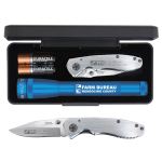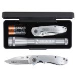 Two great brand names packaged together in a sleek presentation box. The 6.50″ 2AALED Mini-Maglite has MAG-LED technology, can illuminate objects up to 156′ away, comes with 2 “AA” batteries, and is available in black, blue, red, and gray. The Cedar Creek Warhawk knife has a 4″ lightweight stainless-steel handle. 3″ clip point stainless steel blade with thumb stud for easy opening. Comes with clip. Laser engraved. Complies with Prop 65. 6 1/2″ L